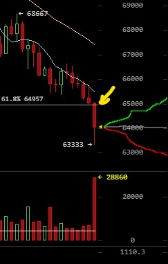Look at the price and volume change as it dropped below 65k (which coincidently lines up with the Fib line I drew a couple days ago) – that line on the 15min chart… this level could be one to watch for short term support